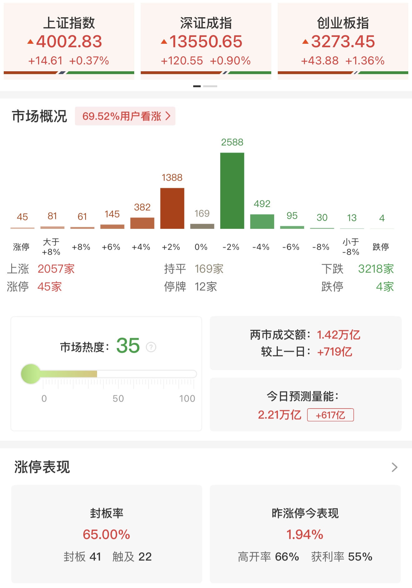 财联社10月29日电,市场早间震荡拉升,沪指盘中回升至4000点上方,创业板指一度涨超2%。沪深两市半日成交额1.42万亿,较上个交易日放量719亿。热点快速轮动,海南板块强势拉升,中钨高新涨停。大金融板块局部爆发,证券板块领涨,华安证券涨停,东北证券触及涨停。有色金属板块再度走强,中信金属触及涨停。量子科技概念反复活跃,科大国创、格尔软件触及涨停,神州信息涨停。下跌方面,银行板块表现疲软,成都银行跌超5%。板块方面,海南、有色金属、证券等板块涨幅居前,银行、物流等板块跌幅居前。截至收盘,沪指涨0.37%,深成指涨0.9%,创业板指涨1.35%。