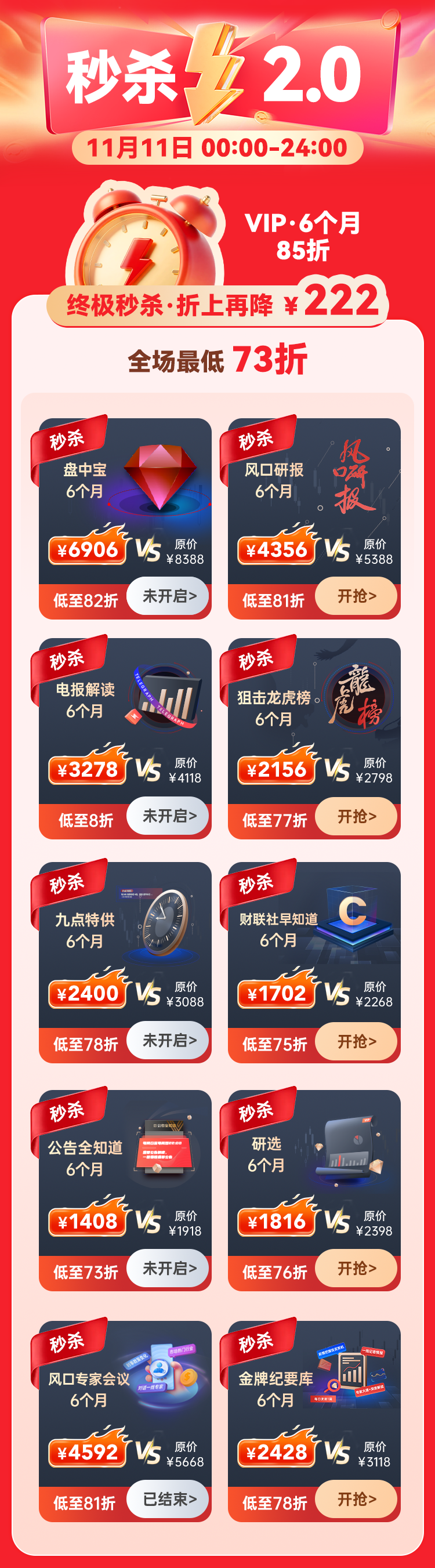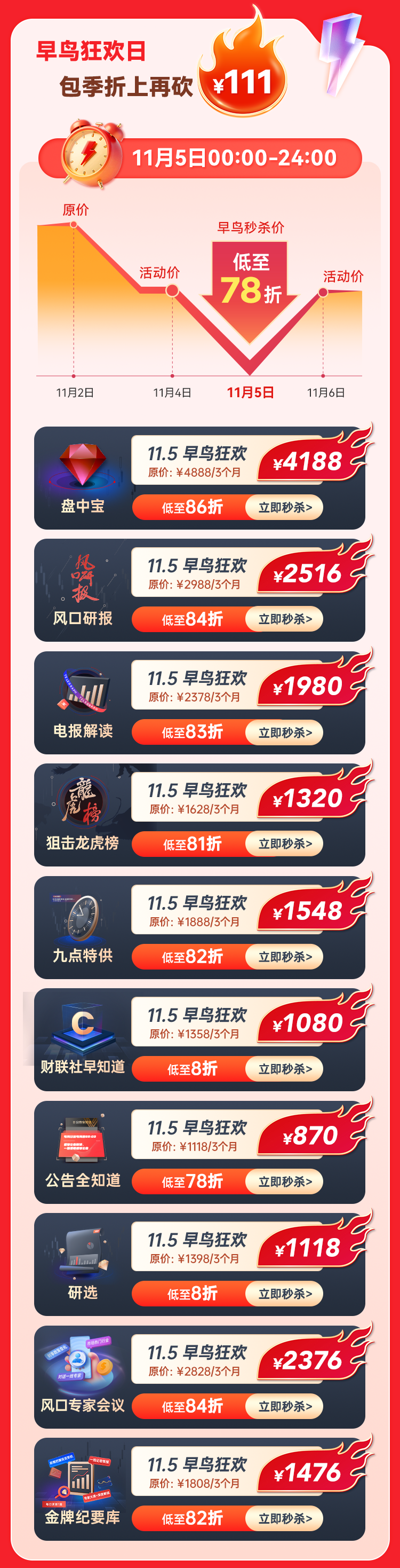 区别于常规折扣,财联社特设“早鸟+终极”两大时间限定节点,以“基础折扣叠额外立减”的双重让利模式,打造全年少有的投研订阅“价格洼地”,稀缺权益分秒递减,错过即无!