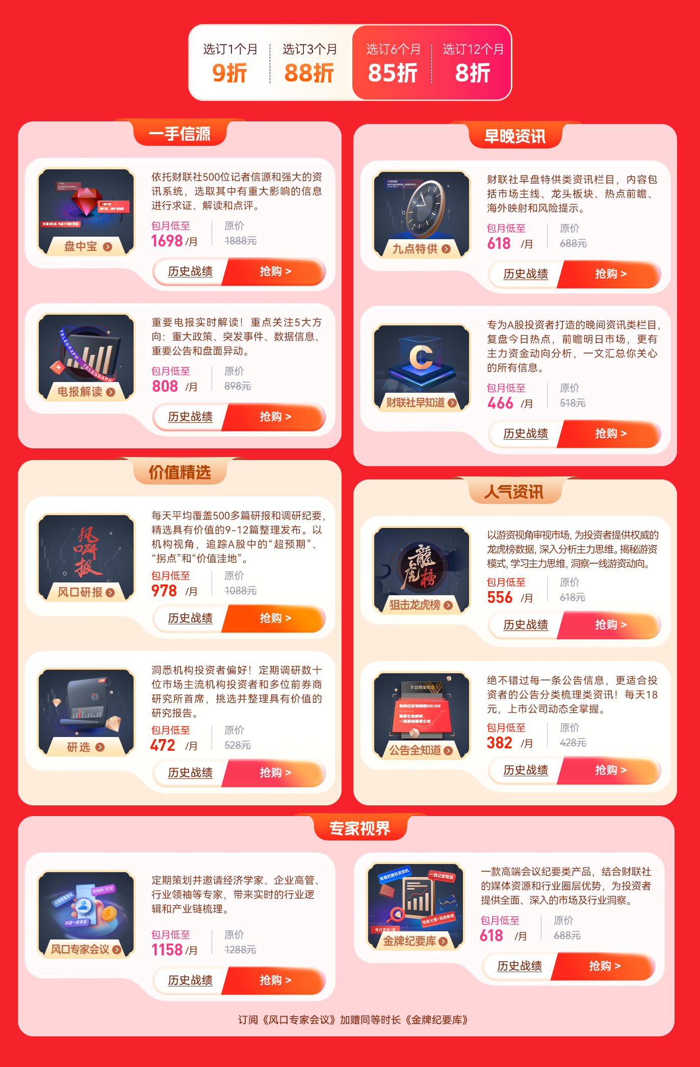 活动期间,财联社打造“阶梯折扣+100%中奖盲盒”双重福利,让订阅成本一降再降,额外权益拿满,投研性价比直接拉至峰值!