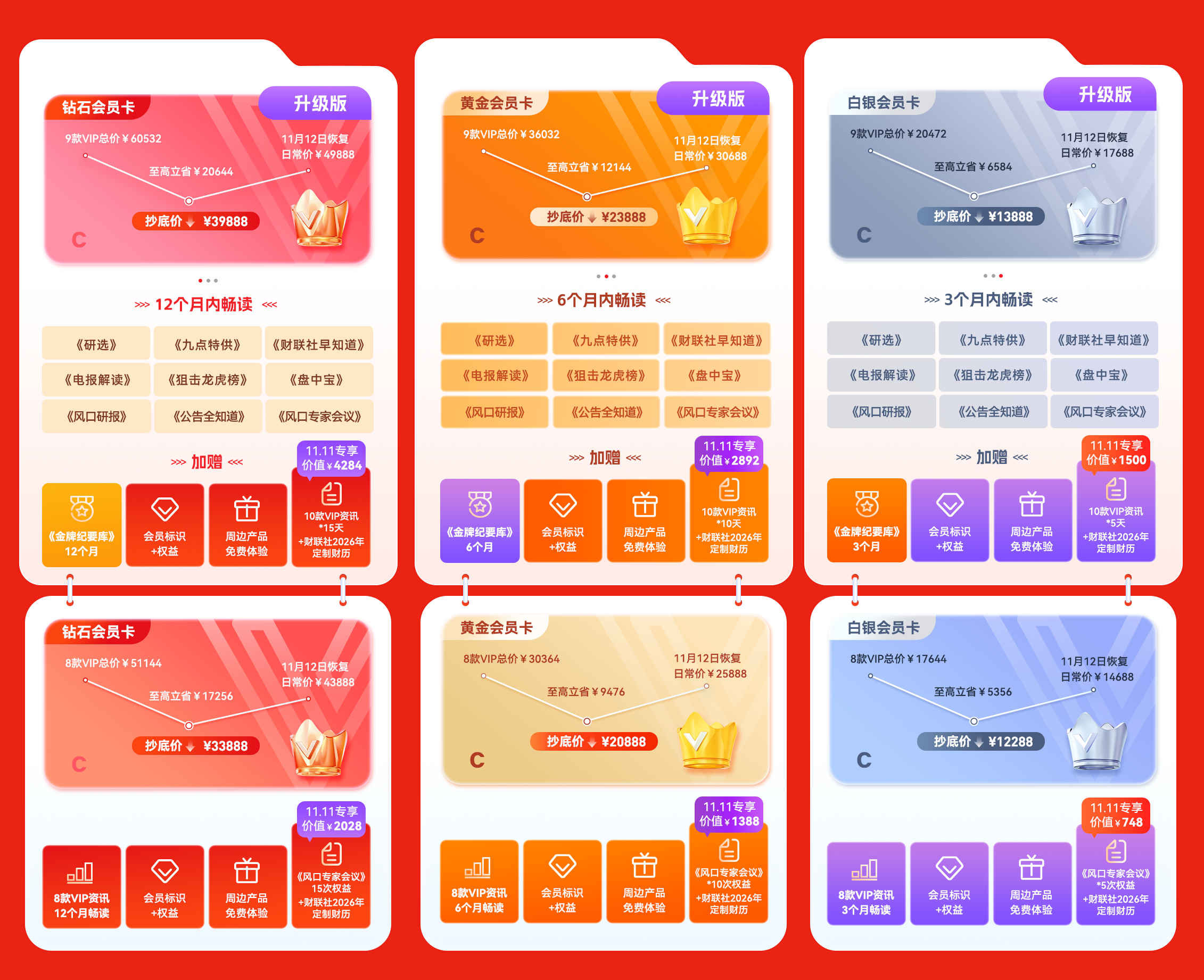 11月3日-11月11日,会员卡专场限时开放,分为“会员升级款”与“8款VIP老版会员卡”两类,每类均设白银、黄金、钻石三档,满足从进阶到资深的全阶段投研需求,且每档均附带高价值加赠权益。