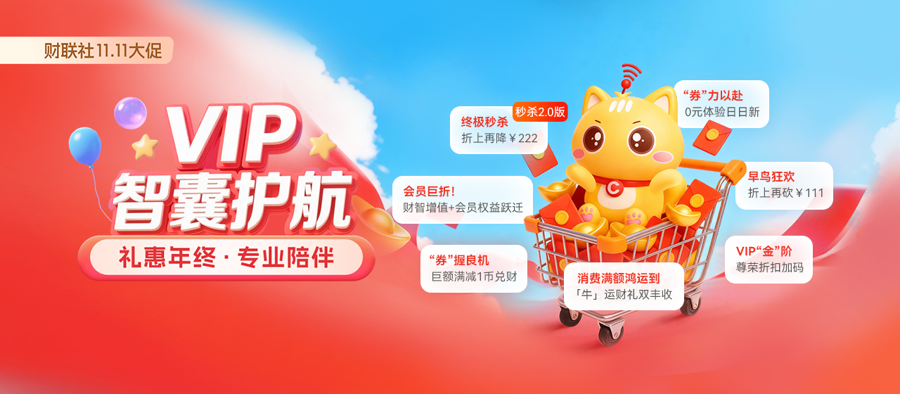 2025年双十一大促,财联社以“智囊护航”为内核,为VIP用户独家定制「年终礼惠·专业陪伴」专场盛宴。从0元尊享权益到冲刺级重磅献礼,六大福利矩阵重磅启幕,为你的智投进阶之路构筑坚实阶梯!