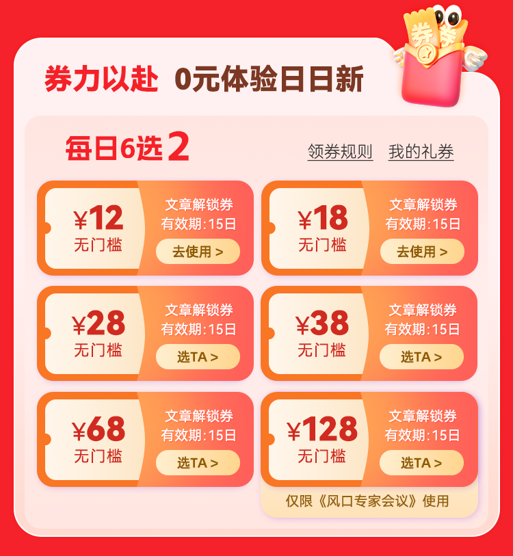 领取后可直接用券解锁感兴趣的VIP资讯,其中¥128元代金券为核心权益——可直通《风口专家会议》,直面产业领袖获取一手趋势研判。