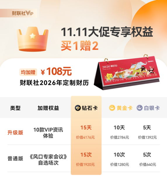 年终福利再升级:在这个双十一,我们限时加赠财联社2026年定制财历。这份财历不止是实物礼,更是“专业资讯伴全年”的象征。