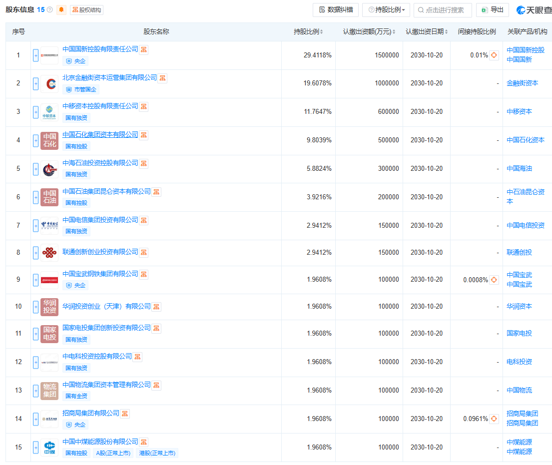 由中国国新控股有限责任公司、北京金融街资本运营集团有限公司、中移资本控股有限责任公司、中国石化集团资本有限公司、中国石油集团昆仑资本有限公司、中国电信集团投资有限公司等共同持股。