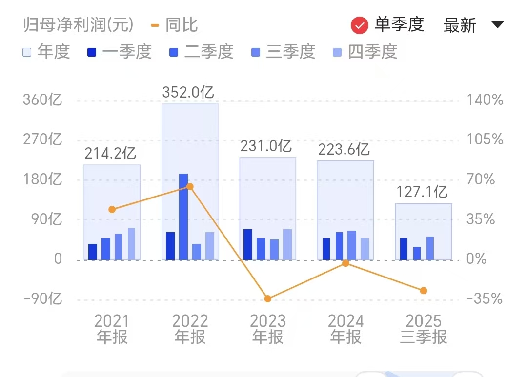 财联社10月29日电,陕西煤业(601225.SH)公告称,公司发布2025年第三季度报告,前三季度实现营业收入1180.83亿元,同比下降12.81%;归属于上市公司股东的净利润为127.13亿元,同比下降27.22%。第三季度实现营业收入401.00亿元,同比下降20.91%;归属于上市公司股东的净利润为50.75亿元,同比下降26.59%。业绩变动主要由于信托资产公允价值受市场波动影响同比浮盈较大。营业外支出主要系本期出售碳排放配额损失等。小财注:Q2净利润28.34亿元,据此计算,Q3净利润环比增长79.08%。