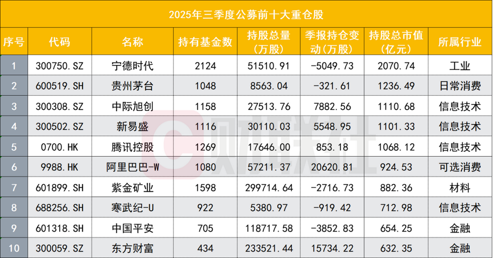 宁德时代继续成为公募持股总市值最高个股,最新持股总市值站上2000亿元关口;贵州茅台、中际旭创、新易盛、腾讯个股等的持股市值也超千亿。