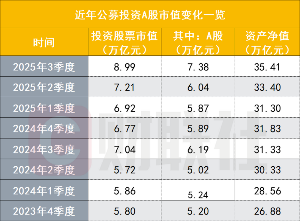今年一季度以来,公募投资A股市值已接连3个季度上攻,直至此次创新高,且第三季度的市值增量达到1.34万亿元,增长显著。