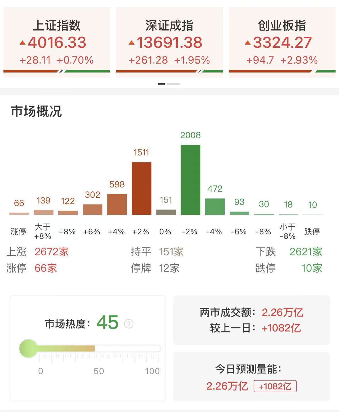 财联社10月29日讯,市场全天震荡拉升,三大指数高开高走,创业板指涨近3%创年内新高,沪指再度回升至4000点上方,北证50指数涨超8%。沪深两市成交额2.26万亿,较上一个交易日放量1082亿。盘面上,市场热点快速轮动,储能板块表现活跃,阳光电源大涨创新高,通润装备涨停。光伏板块爆发,隆基绿能、通威股份等多股涨停。有色金属板块快速拉升,中孚实业涨停。海南板块全天走强,中钨高新、海汽集团涨停。下跌方面,银行股集体下跌,成都银行跌近6%。截至收盘,沪指涨0.7%,深成指涨1.95%,创业板指涨2.93%