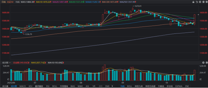 财联社10月29日讯(编辑 梓隆),今日(10月29日),北证50指数迎来长阳大涨,截至收盘,其全天涨幅达8.41%,收盘点位再次站上1500点,并创近1个月以来新高。若以年内行情统计,北证50指数今年以来的涨幅达51.6%,超越科创50(50.58%)。
