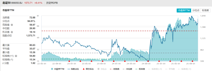 此外,由于北证50指数今日大涨,其目前估值水平也大幅提高。截至10月29日数据,北证50指数目前市盈率达72.88倍,处于历史94.81%分位点;市净率达5.52倍,处于近十年98.82%分位点。从历史数据上看,北证50指数曾于今年9月8日录得历史最高市盈率纪录(80.63倍)、市净率纪录(73.81倍)。