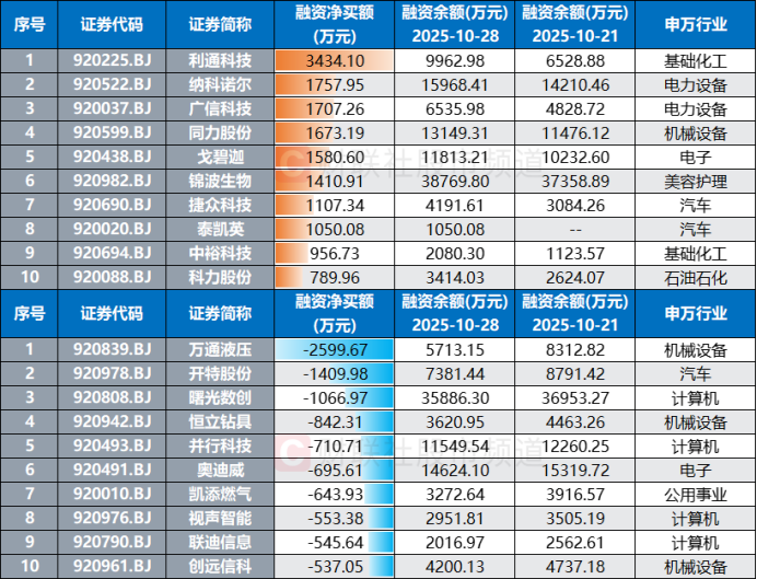 从融资客近期动向上看,截至10月28日数据,在近5个交易日行情中,共有61股获融资客超100万元加仓,占北证两融标的近21.9%。其中,利通科技、纳科诺尔、广信科技、同力股份、戈碧迦、锦波生物、捷众科技、泰凯英8股融资净买额超1000万元。而万通液压、开特股份、曙光数创近日遭融资客大幅减持,近5日融资净卖额均在1000万元以上。