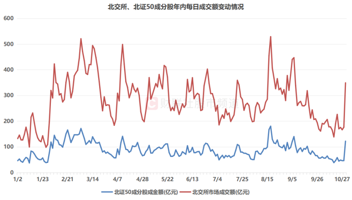 注:北交所、北证50成分股年内每日成交额变动情况(截至10月29日收盘)
