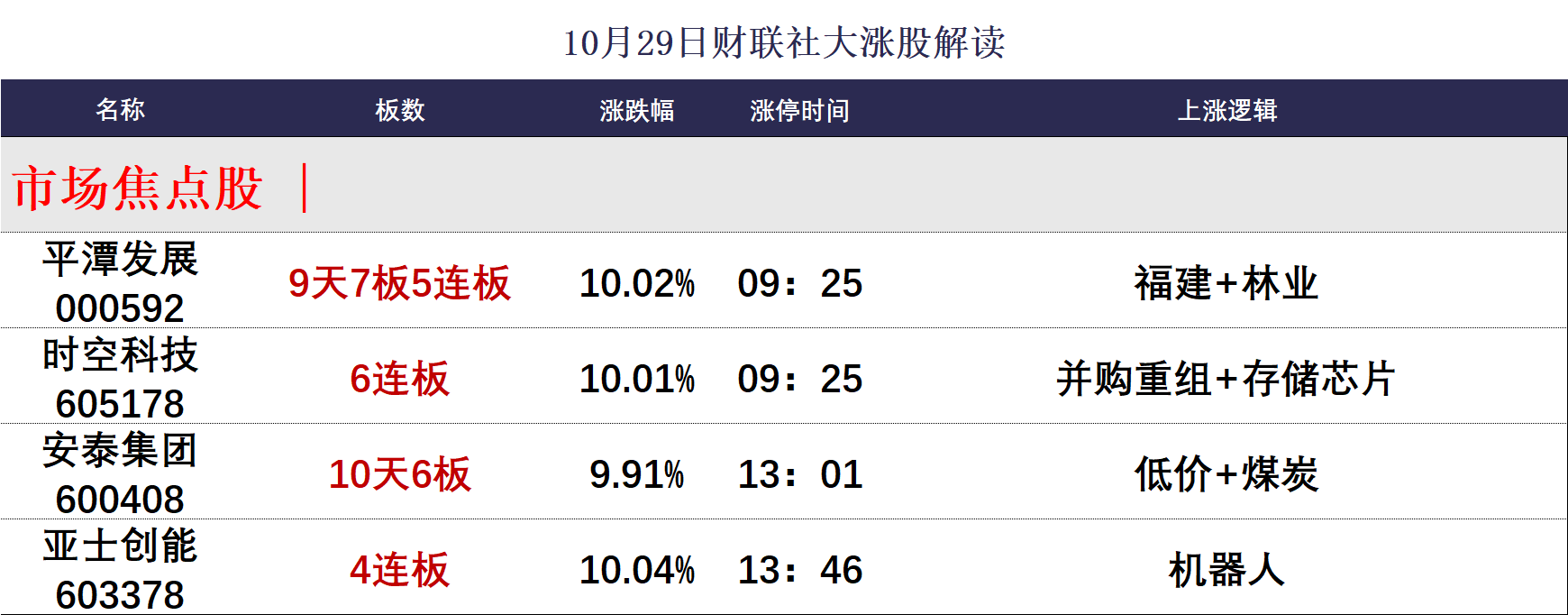 财联社10月29日讯,今日60股涨停,30股炸板,封板率为67%,时空科技6连板,平潭发展9天7板,安泰集团10天6板,上海电力15天5板,亚士创能4连板,北交所利通科技、锦华新材、三祥科技、数字人30cm首板。市场全天震荡拉升,三大指数高开高走,创业板指涨近3%创年内新高,沪指再度回升至4000点上方,北证50指数涨超8%。沪深两市成交额2.26万亿,较上一个交易日放量1082亿。板块方面,海南、光伏、有色金属等板块涨幅居前,银行、影视院线等板块跌幅居前。截至收盘,沪指涨0.7%,深成指涨1.95%,创业板指涨2.93%。