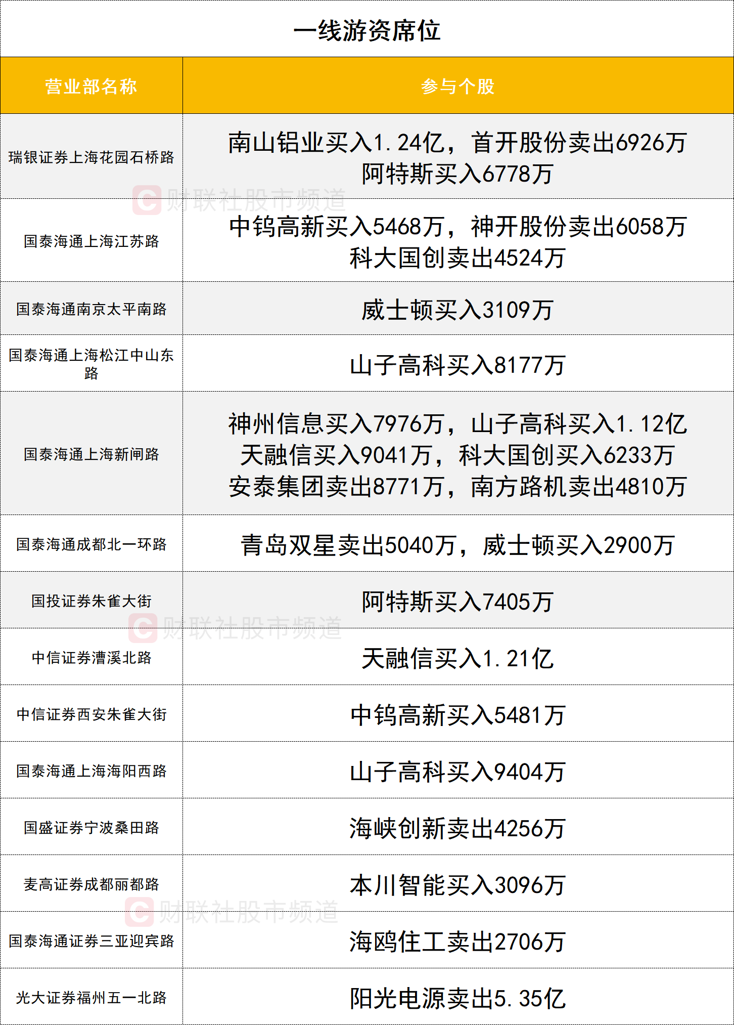 一线游资活跃度较高,南山铝业获一家一线游资席位买入1.24亿。阳光电源遭一家一线游资席位(光大证券福州五一北路)大幅卖出5.35亿。山子高科获三家一线游资席位合计买入2.8亿。