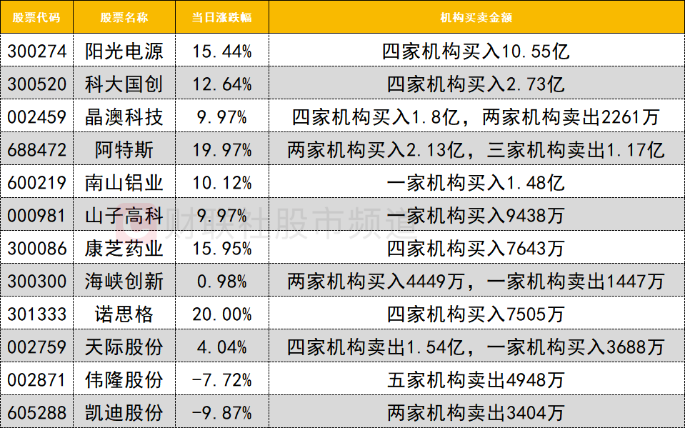 卖出方面,固态电池概念股天际股份遭四家机构卖出1.54亿。今日阿特斯20cm涨停,遭三家机构卖出1.17亿,同时获两家机构买入2.13亿。