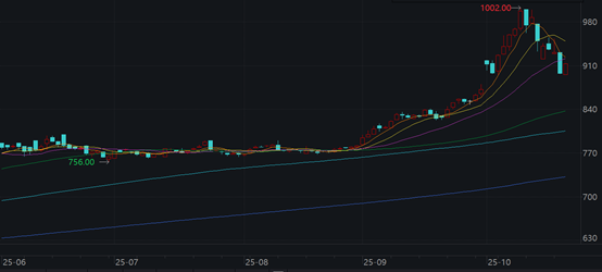 沪金现货在10月17日历史性的突破1000元/克后,行情急转直下。之后7个交易日,沪金现货自高点跌去约100元,10月28日回到900元/克下方。