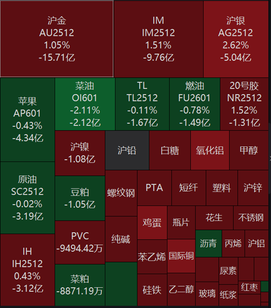华西证券宏观固收团队指出,贵金属期货现“踩踏式”资金离场。10月28日,贵金属板块成为资金抛售的主要品种,沪金、沪银分别遭遇55亿元和22亿元的大额流出。同时有色金属板块亦未能幸免,沪铜品种单日资金流出高达22亿元。