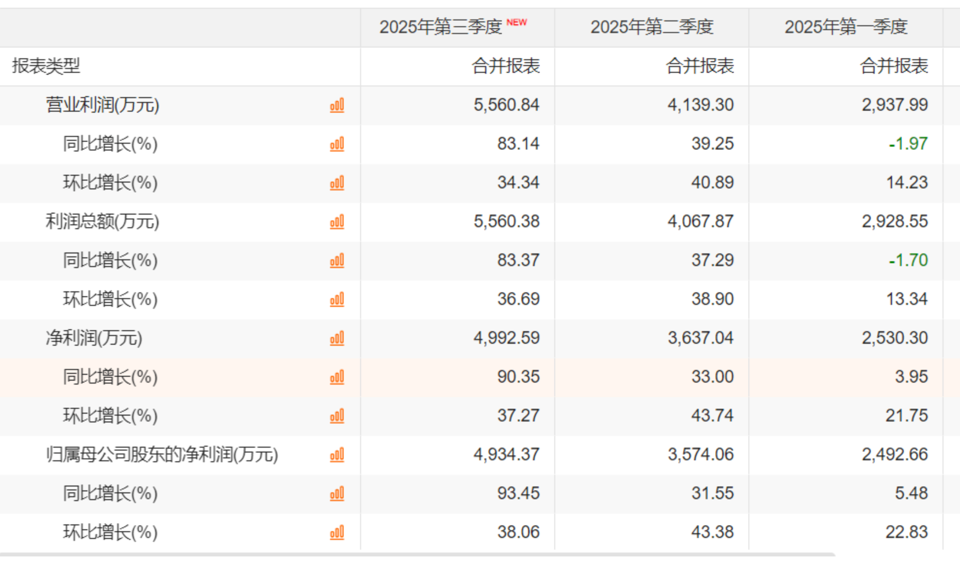 从季度业绩动态来看,超达装备2025年盈利呈现逐季加速突破的强劲态势,核心财务指标连续三个季度实现环比正增长。其中,一季度归母净利润同比增长5.48%,二季度提速至31.55%,三季度更是飙升至93.45%,环比增幅达38.06%。各季度盈利绝对额持续攀升,环比增速维持高位,反映出公司季度间盈利扩张节奏稳健,规模效应逐步显现。