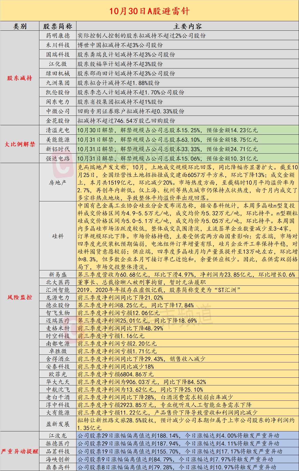 导读:财联社10月30日投资避雷针,近日,A股及海外市场潜在风险事件如下。国内经济信息方面包括:1)10月全国土地成交规模环比回落,溢价率再创年内新低;2)累库压力仍存,本周多晶硅市场弱稳延续;公司方面重点关注包括:1)新易盛第三季度营收为60.68亿元,环比下滑4.97%,净利润为23.85亿元,环比增长0.6%;2)汇洲智能2019、2020年年报存在虚假记载,股票简称变更为“ST汇洲”;海外市场重点关注包括:1)美联储主席鲍威尔表示,12月的利率下调“远非”已成定局;2)Meta美股盘后一度跌超8%。