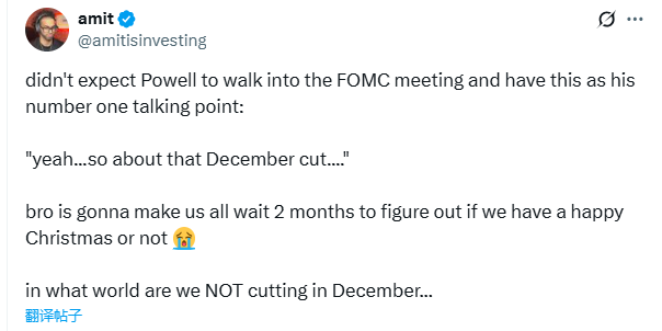 一位用户在X论坛上发帖感慨道,“远非确定”表明鲍威尔确实深谙言辞的锋芒。另一位用户则发帖称,“这哥们儿要让我们等两个月才能知道我们能不能过个快乐的圣诞节。”