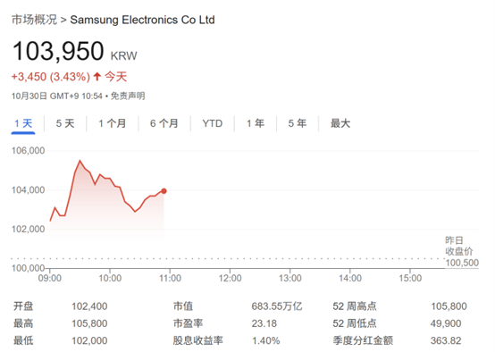 在第三季度财报公布后,三星股价应声上涨,截至发稿,上涨3.4%,报103950韩元。盘中一度涨至105800韩元,再创历史新高。过去几个月,随着AI浪潮推升芯片需求,三星股价持续攀升,年内涨幅已经高达逾90%。