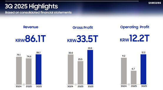 具体来看,三星第三季度营收为86.1万亿韩元,同比增长8.85%,高于LSEG SmartEstimate预期的85.93万亿韩元;