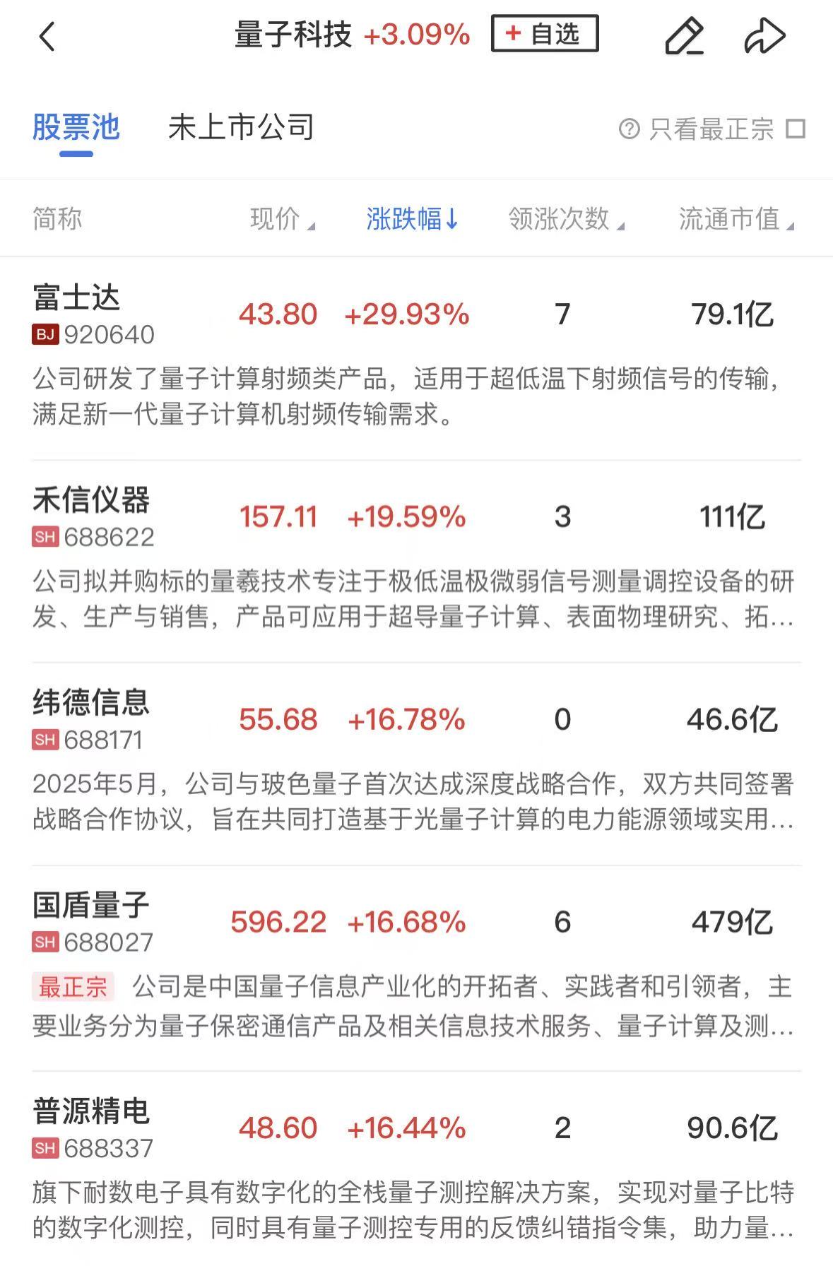 板块上,量子科技概念股延续强势,富士达30CM涨停,禾信仪器、浙江东方、神州信息等涨停,国盾量子、信安世纪、普源精电涨超10%。