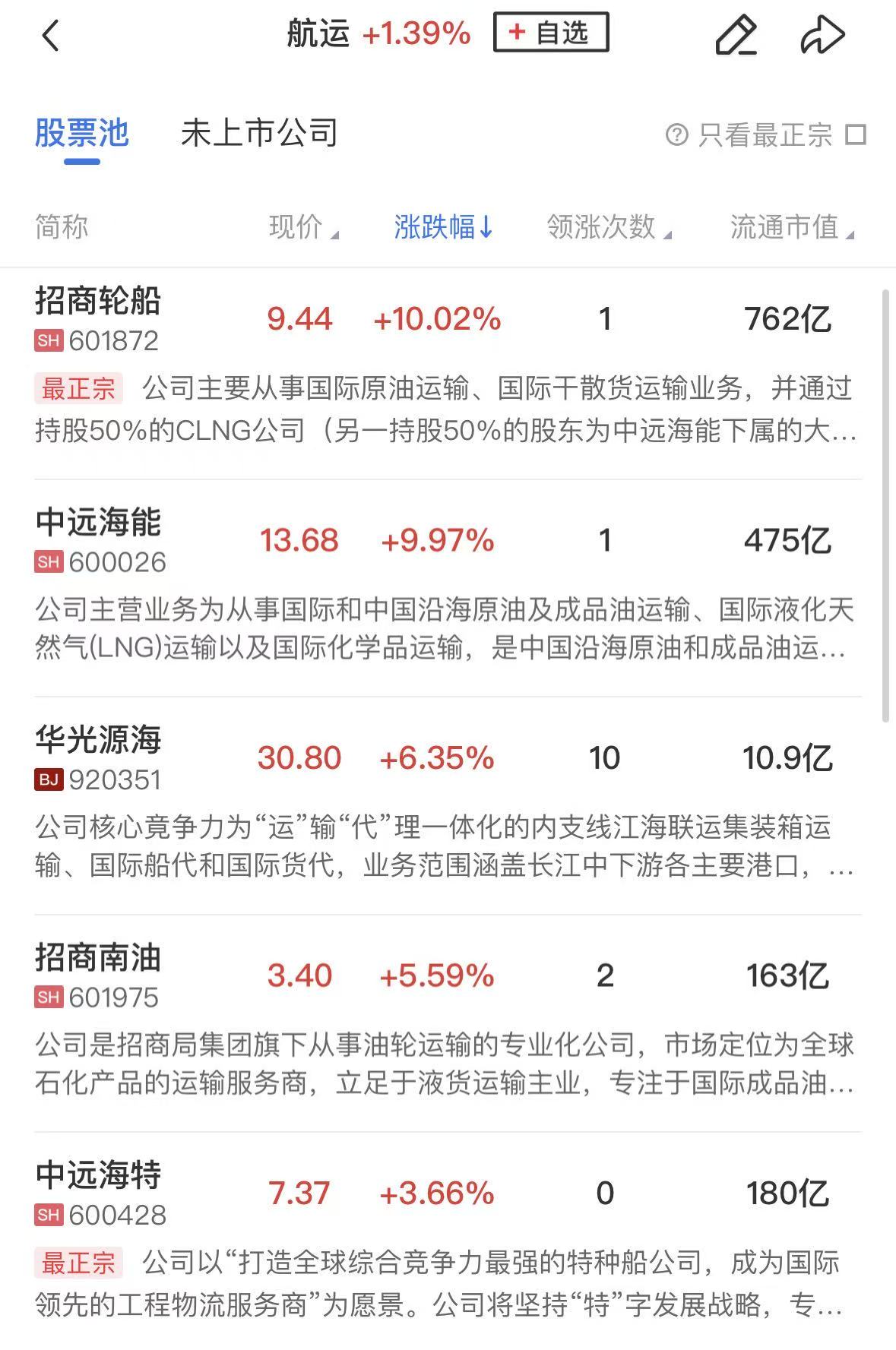 港口航运板块表现活跃,招商轮船、中远海能涨停,招商南油、南京港、中远海特涨幅居前。