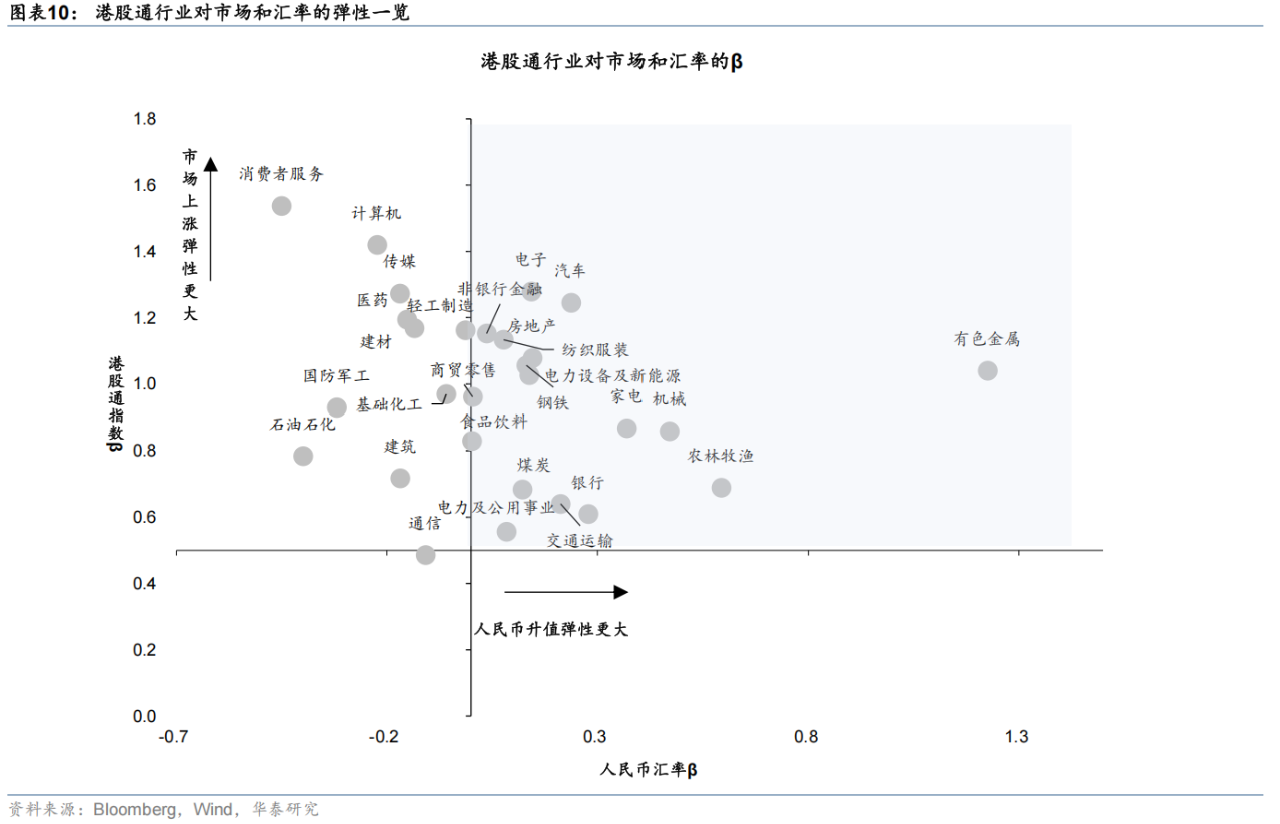 从历史经验看,人民币升值期间市场普遍上涨,港股弹性更大。一方面因为汇率和股市都是对经济预期改善的共同反应。另一方面市场情绪、外资流向和企业基本面也会被汇率变化影响。由于汇率变化和市场上涨往往同步发生,在剔除市场因子影响后,有色、农林牧渔、机械等板块对汇率升值更敏感。综合市场因子和汇率因子看,以恒生科技为代表的港股成长风格在升值区间更为占优。
