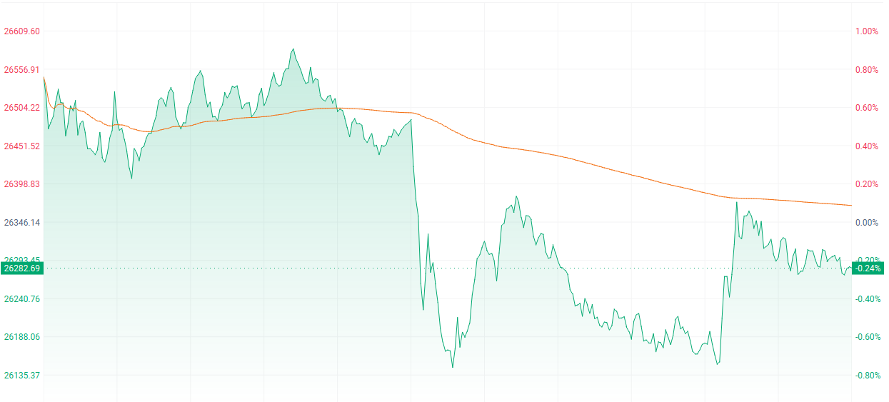 财联社10月30日讯(编辑胡家荣)港股三大指数今日集体回调。截至收盘,恒生指数跌0.24%,报26282.69点;科技指数跌0.68%,报6051.76点;国企指数跌0.31%,报9346.86点。