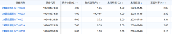 目前,冀中能源共有5只存续债券,规模25亿元,全部为去年发行的中期票据。11月18日,“24冀能股份MTN003A”将回售0.97亿元, 7亿元的“24冀能股份MTN001A”也将在明年2月到期。