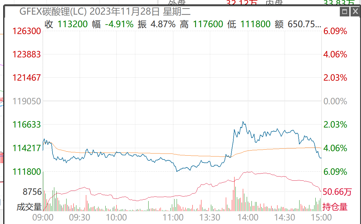 这也与当天行情方向相配合,Wind数据显示,2023年11月28日,碳酸锂主力合约续跌4.91%,连续两日领跌国内商品期货市场。