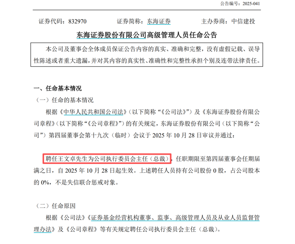 根据公开资料,王文卓出生于1971年,现年54岁,硕士学位,在金融行业深耕多年。此前曾在中国人民银行系统多个岗位任职,后出任国家外汇管理局常州市中心支局副局长;江苏省常州市地方金融局副局长、三级调研员;江苏省常州市国有资产监督管理委员会党委书记、主任;并于2024年2月出任东海证券党委书记、董事长,今年4月至10月代行总经理职务,直至此次履新。