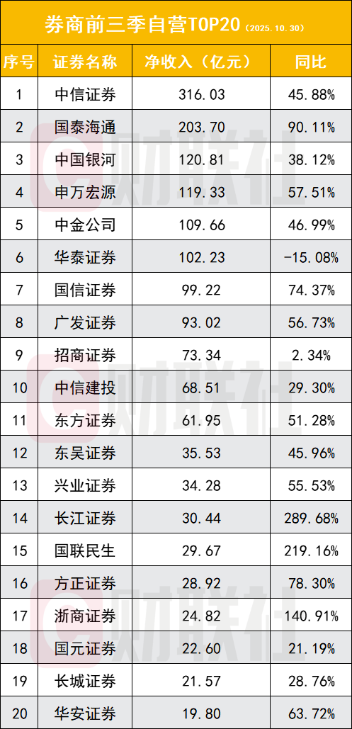 具体来看,自营业务净收入TOP10为中信证券(316.03亿元)、国泰海通(203.7亿元)、中国银河(120.81亿元)、申万宏源(119.33亿元)、中金公司(109.66亿元)、华泰证券(102.23亿元)、国信证券(99.22亿元)、广发证券(93.02亿元)、招商证券(73.34亿元)、中信建投(68.51亿元)。