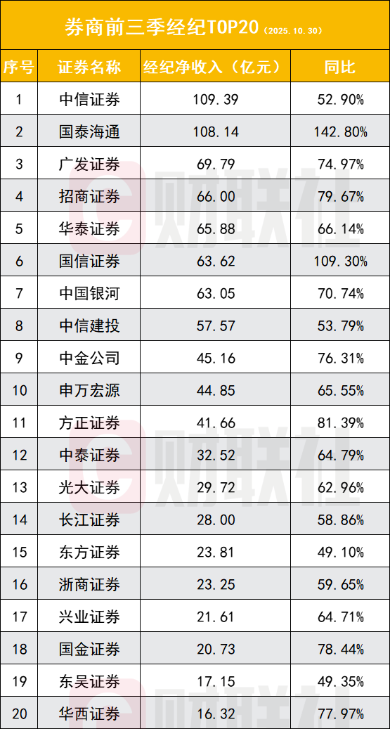 经纪业务净收入TOP10为中信证券(109.39亿元)、国泰海通(108.14亿元)、广发证券(69.79亿元)、招商证券(66亿元)、华泰证券(65.88亿元)、国信证券(63.62亿元)、中国银河(63.05亿元)、中信建投(57.57亿元)、中金公司(45.16亿元)、申万宏源(44.85亿元)。