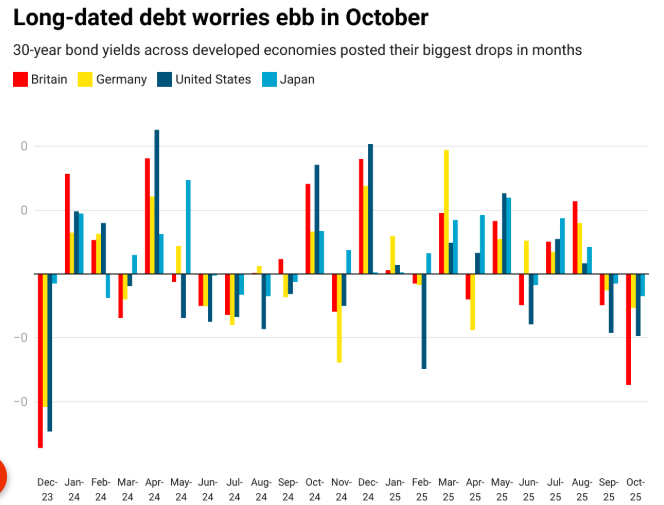 但10月的整体走势仍表明,全球国债市场压力正在减弱——这对面临关键预算案的英国和深陷政治动荡的法国而言都是利好消息。美国10年期国债收益率目前有望连续第三个月下跌,收益率以月线跌势收官十月。