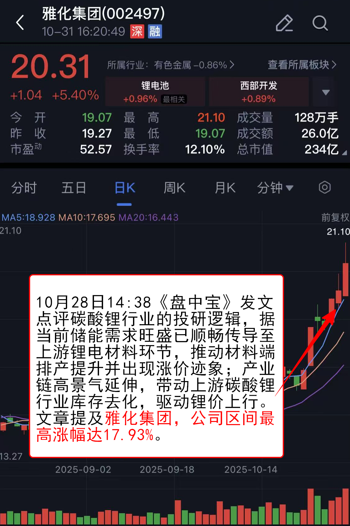 10月28日14:38《盘中宝》发文点评碳酸锂行业的投研逻辑,据当前储能需求旺盛已顺畅传导至上游锂电材料环节,推动材料端排产提升并出现涨价迹象;产业链高景气延伸,带动上游碳酸锂行业库存去化,驱动锂价上行。文章提及雅化集团,公司区间最高涨幅达17.93%。