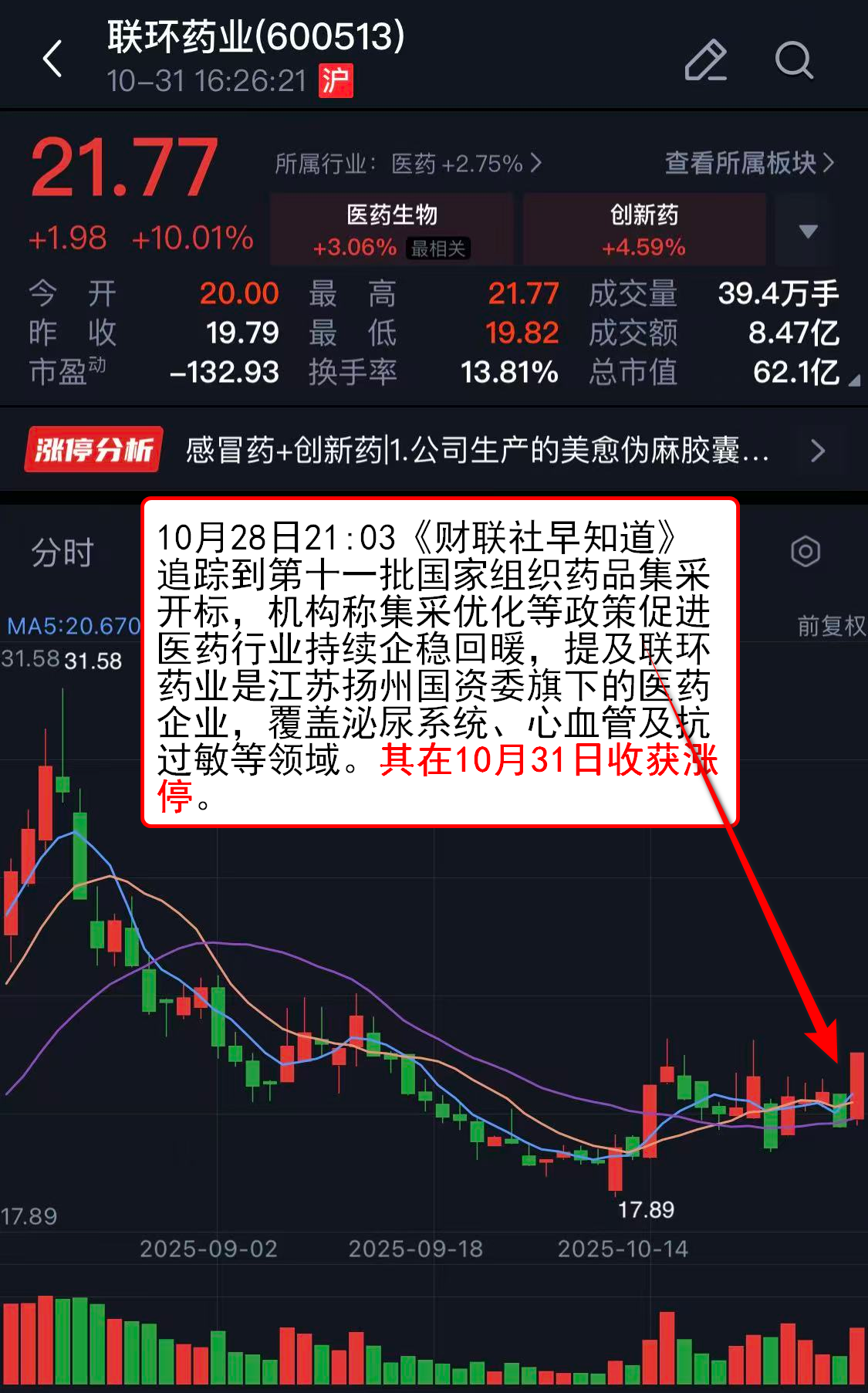 10月28日21:03《财联社早知道》追踪到第十一批国家组织药品集采开标,机构称集采优化等政策促进医药行业持续企稳回暖,提及联环药业是江苏扬州国资委旗下的医药企业,覆盖泌尿系统、心血管及抗过敏等领域。其在10月31日收获涨停。