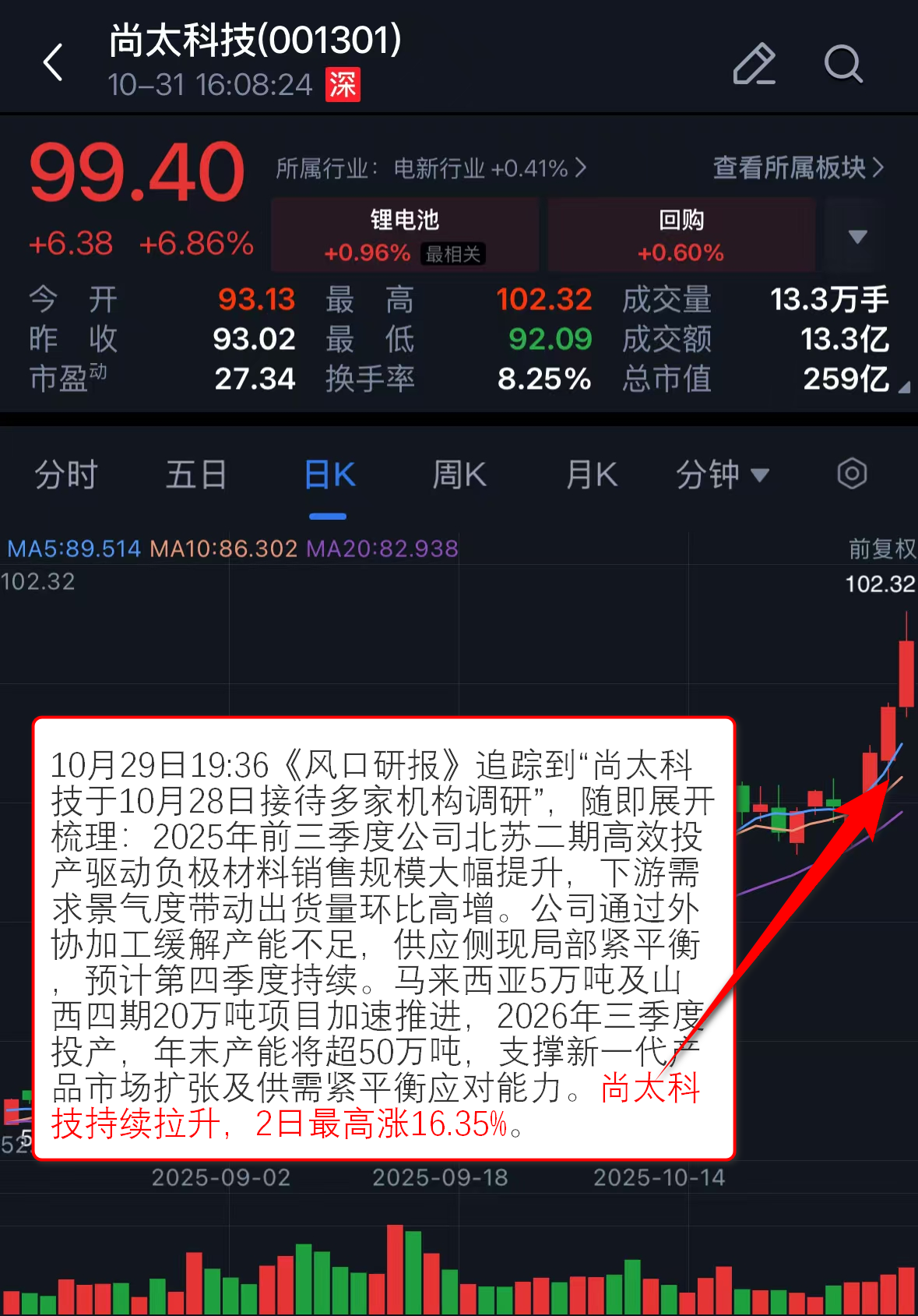 10月29日19:36《风口研报》追踪到“尚太科技于10月28日接待多家机构调研”,随即展开梳理:2025年前三季度公司北苏二期高效投产驱动负极材料销售规模大幅提升,下游需求景气度带动出货量环比高增。公司通过外协加工缓解产能不足,供应侧现局部紧平衡,预计第四季度持续。马来西亚5万吨及山西四期20万吨项目加速推进,2026年三季度投产,年末产能将超50万吨,支撑新一代产品市场扩张及供需紧平衡应对能力。尚太科技持续拉升,2日最高涨16.35%。