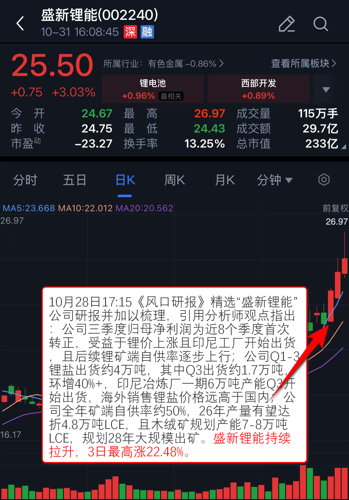 10月28日17:15《风口研报》精选“盛新锂能”公司研报并加以梳理,引用分析师观点指出:公司三季度归母净利润为近8个季度首次转正,受益于锂价上涨且印尼工厂开始出货,且后续锂矿端自供率逐步上行;公司Q1-3锂盐出货约4万吨,其中Q3出货约1.7万吨,环增40%+,印尼冶炼厂一期6万吨产能Q3开始出货,海外销售锂盐价格远高于国内;公司全年矿端自供率约50%,26年产量有望达折4.8万吨LCE,且木绒矿规划产能7-8万吨LCE,规划28年大规模出矿。盛新锂能持续拉升,3日最高涨22.48%。