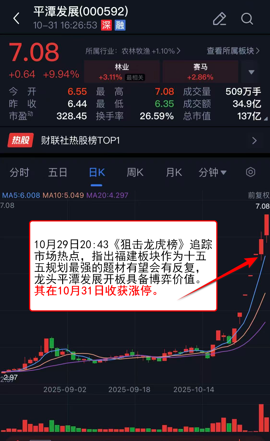 10月29日20:43《狙击龙虎榜》追踪市场热点,指出福建板块作为十五五规划最强的题材有望会有反复,龙头平潭发展开板具备博弈价值。其在10月31日收获涨停。