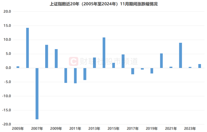 注:上证指数近20年(2005年至2024年)11月期间涨跌幅情况