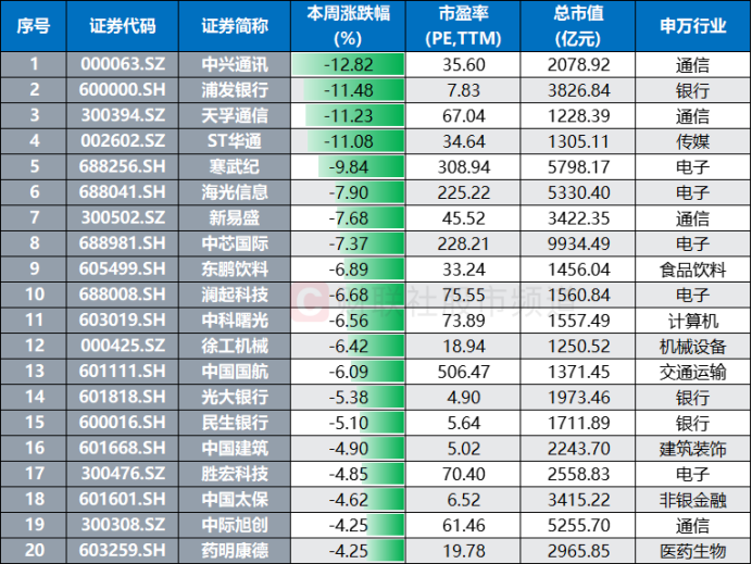 本周以来,此前强势的权重股涨势暂歇,截至今日收盘,剔除新股影响,千亿市值股中共有近6成周内收跌,平均跌幅近0.3%。其中,中兴通讯、浦发银行、天孚通信、ST华通本周跌幅分别达12.8%、11.5%、11.2%、11.1%,寒武纪、海光信息、新易盛、中芯国际等人气权重股也于周内跌幅明显。以行业层面统计,这些大跌权重股主要集中在通信、电子板块。