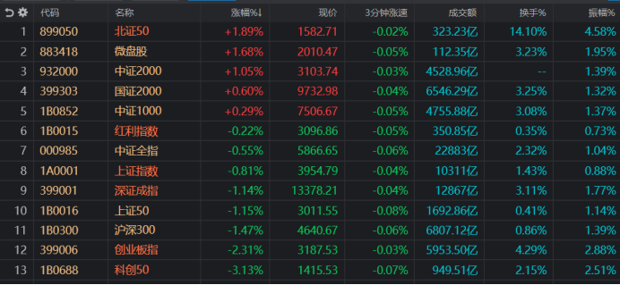 财联社10月31日讯(编辑 梓隆),今日(10月31日),大小盘股表现分化,截至收盘,小微盘股指数中证2000、国证2000分别上涨近1.1%、0.6%,而代表权重股的上证50、沪深300则均跌超1%。
