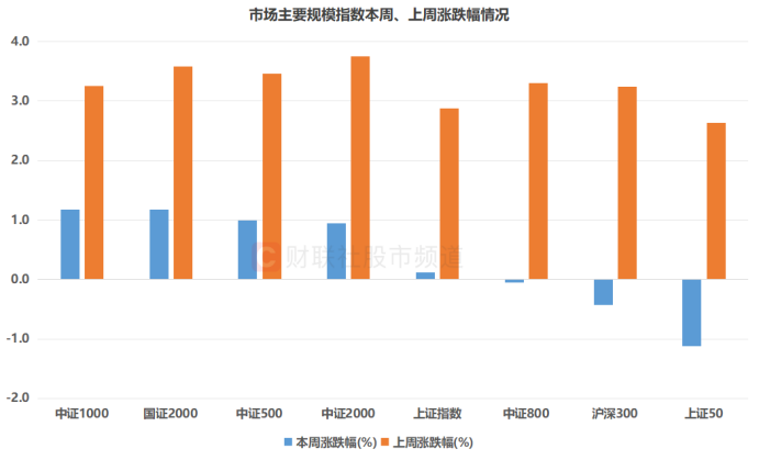 从指数表现上看,上证指数周内接近平盘,截至今日收盘,其本周小涨0.1%,中证全指涨幅稍优,达0.4%。而在市场主要规模指数方面,相较于上周集体上涨的态势,权重股指数本周则迎来明显调整,尤其是上证50、沪深300指数双双领跌,而代表中小盘股指数的中证1000、国证2000、中证500、中证2000近日热度不减,周内均录得近1%的涨幅。
