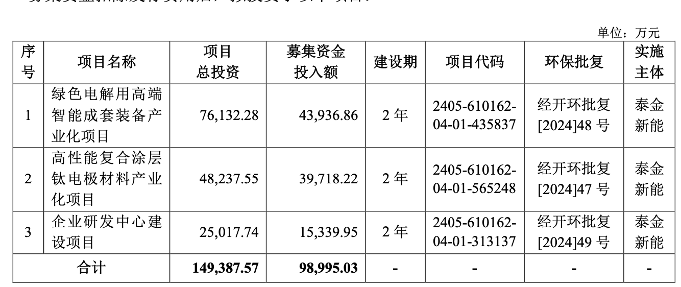 此次IPO,泰金新能原拟募资15亿元,此后募资额度下调至9.9亿元,用于绿色电解用高端智能成套装备产业化项目等三大项目。