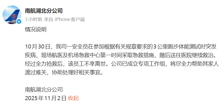 10月30日,我司一安全员在参加根据有关规章要求的3公里跑步体能测试时突发疾病,现场航医及机场急救中心第一时间采取急救措施,随后送往医院继续救治。经过全力抢救后,该员工不幸离世。公司已成立专项工作组,将尽全力帮助其家人渡过难关,协助处理好相关事宜。