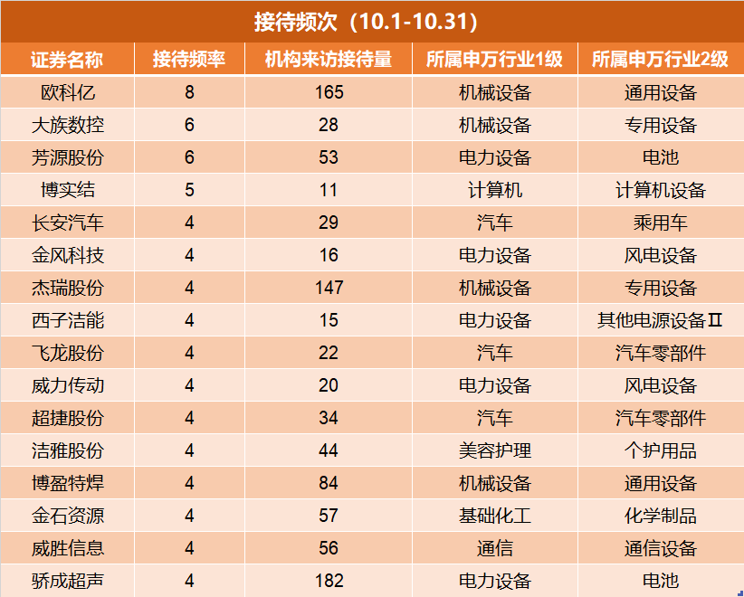 财联社11月2日讯(编辑 宣林)据Choice数据统计,沪深京三市10月(10.1-10.31)共有957家上市公司接受机构调研。具体来看,接待机构调研次数最多的上市公司是欧科亿,达8次;大族数控和芳源股份位列第二,接待次数为6次;博实结紧随其后,接待次数为5次。具体详见下图:
