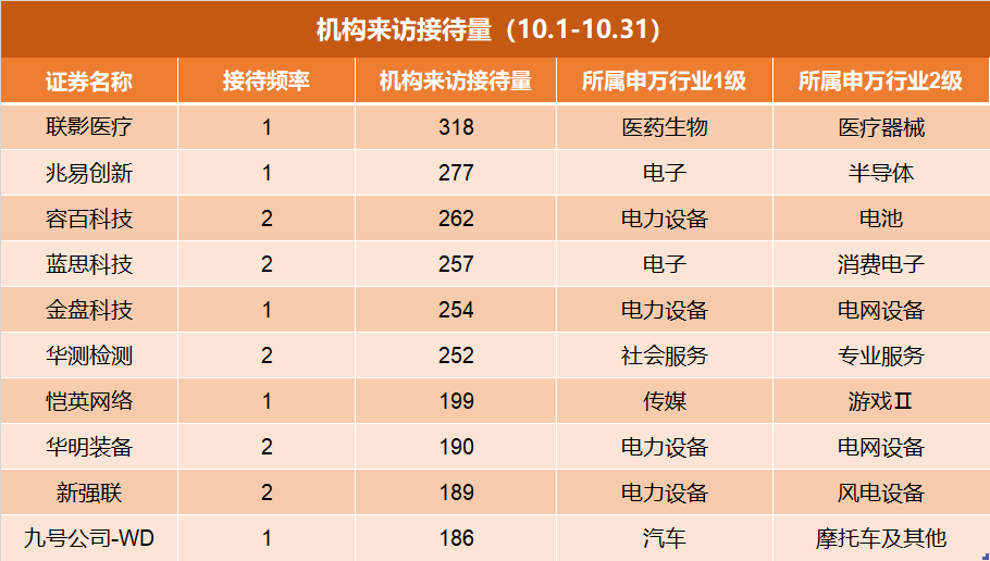 按机构来访接待量统计,联影医疗、兆易创新、容百科技、蓝思科技、金盘科技、华测检测、恺英网络、华明装备、新强联和九号公司机构来访接待量位列前十。前三名联影医疗、兆易创新和容百科技机构来访接待量分别达318家、277家和262家。具体详见下图: