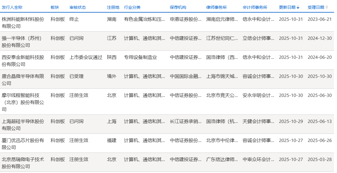 其中,株洲科能科创板IPO终止;泰金新能过会并提交注册;盛合晶微审核状态为已受理;强一股份、上海超硅审核状态为已问询;摩尔线程、优迅股份、昂瑞微注册生效。